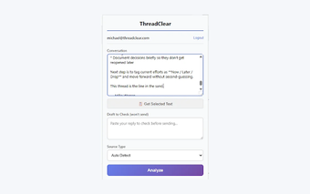ThreadClear to darmowy dodatek do przeglądarki Chrome, który umożliwia analizę wątków e-mailowych oraz rozmów, pomagając użytkownikom w identyfikacji nieodpowiedzianych pytań, punktów napięcia oraz ocenie ryzyka komunikacyjnego. Umożliwia on użytkownikom lepsze zrozumienie dynamiki rozmów i dostarcza cennych wskazówek dotyczących efektywnej komunikacji. Dzięki funkcji sprawdzania szkiców, użytkownicy mogą ocenić ton oraz potencjalne braki w odpowiedziach przed wysłaniem wiadomości.
